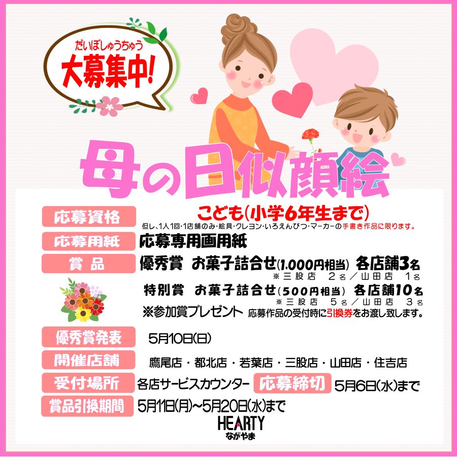 HEARTYなかやまの恒例イベント「母の日似顔絵企画」、今年も開催決定! 毎日頑張ってくれているお母さんへ、お子様の手で描く似顔絵ほど心に響くプレゼントはありません。「いつもありがとう」の気持ちを、お子様の感性そのままに […]